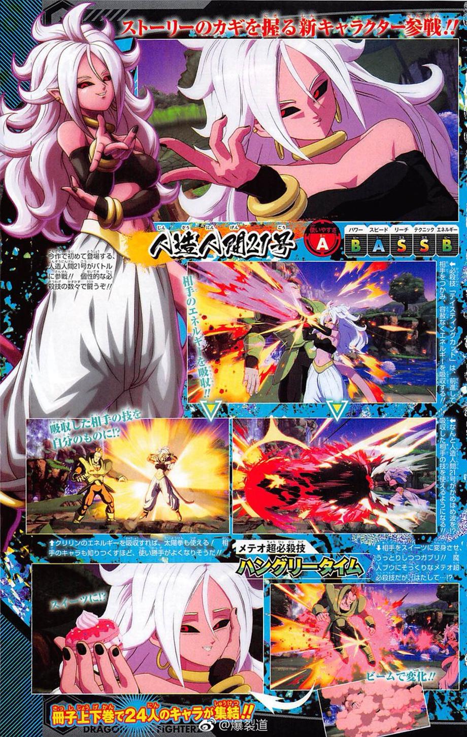 According to V-Jump magazine, Android 21 is the last base-game, playable character, meaning all new character announced after this point will be DLC.  It also revealed that Android 21, in her base form, IS NOT playable.