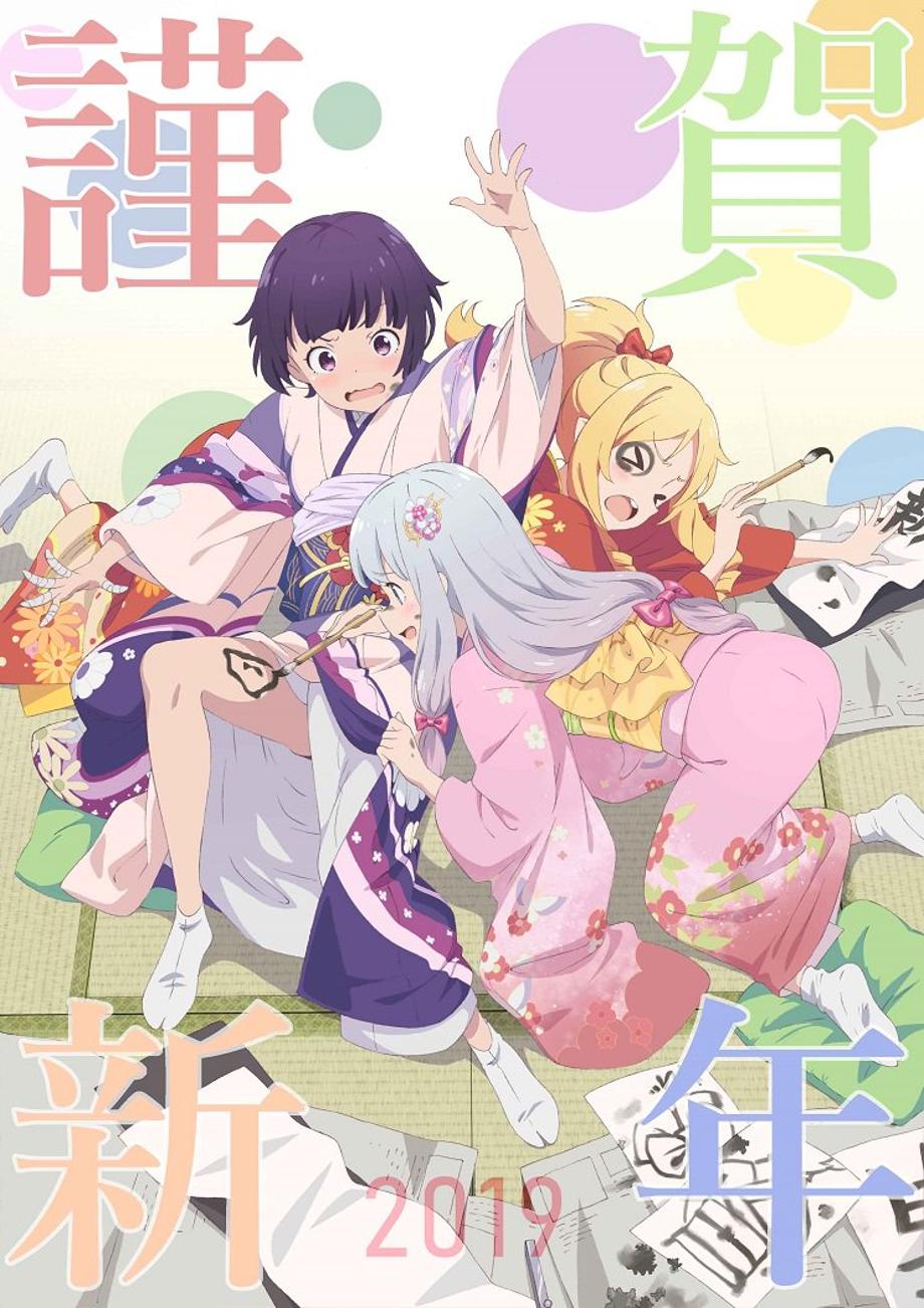 The upcoming original video animation of the popular ecchi romance anime series, Eromanga-sensei, has shared a new art piece celebrating the New Year. The anime series is adapting the light novel series wirtten by Tsukasa Fushimi and illustrated by Hiro Kanzaki. The OVA will be out on January 16, 2019. The promotional image features the three main girls of the show fooling around wearing yukatas.