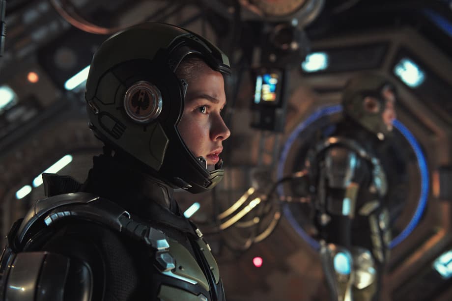 (L to R) Cadets Amara (CAILEE SPAENY), Vik (IVANNA SAKHNO) and Jinhai (WESLEY WONG) co-pilot the Bracer Phoenix Conn-Pod in "Pacific Rim Uprising." The globe-spanning conflict between otherworldly monsters of mass destruction and the human-piloted super-machines built to vanquish them was only a prelude to the all-out assault on humanity.
