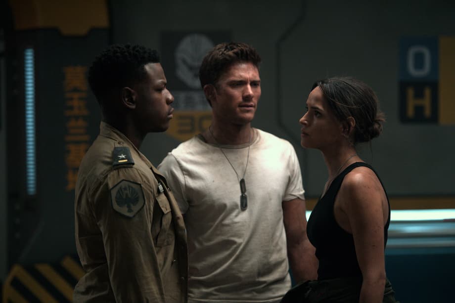 (L to R) JOHN BOYEGA as Jake, SCOTT EASTWOOD as Lambert and ADRIA ARJONA as Jules Reyes in "Pacific Rim Uprising." The globe-spanning conflict between otherworldly monsters of mass destruction and the human-piloted super-machines built to vanquish them was only a prelude to the all-out assault on humanity.