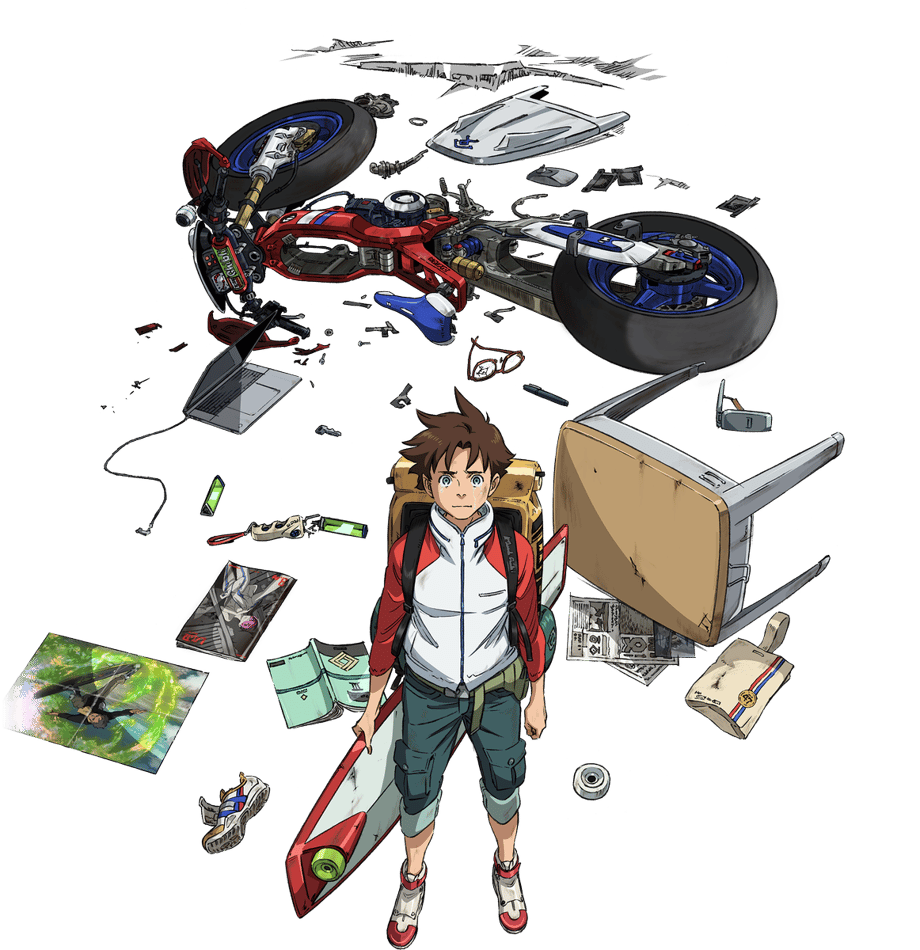 Eureka Seven began in 2005 as an original anime series from Studio Bones.  It was directed by Tomoki Kyoda, written by  Dai Satō and featured character designs from  Shoji Kawamori.   Bones developed the series in collaboartion with Bandai Visual.  The series takes place in the year 12005 and follows Renton, the fourteen-year-old son of a millitary researched credited with saving the world.  Living a mundan life, Renton's world is thrown upside down when a large mecha called the Nirvash type ZERO crashes into his bedroom and a green-haired female pilot named Eureka spills out of the cockpit.