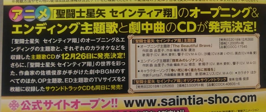 Saint Seiya: Saintia Shou has no staff listed as or right now and there is no information regarding opening or ending themes. However, here are the main voice actors: Inori Minase as Saori Kido, Aina Suzuki as Shouko Equuleus and Megumi Nakajima as Mii Dolphin.