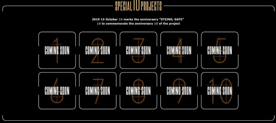 Steins;Gate opened today, teasing 10 announcements for the title's 10th Anniversary. There are apparently going to be 10 projects announced on the visual novel's anniversary date, October 15, 2019.